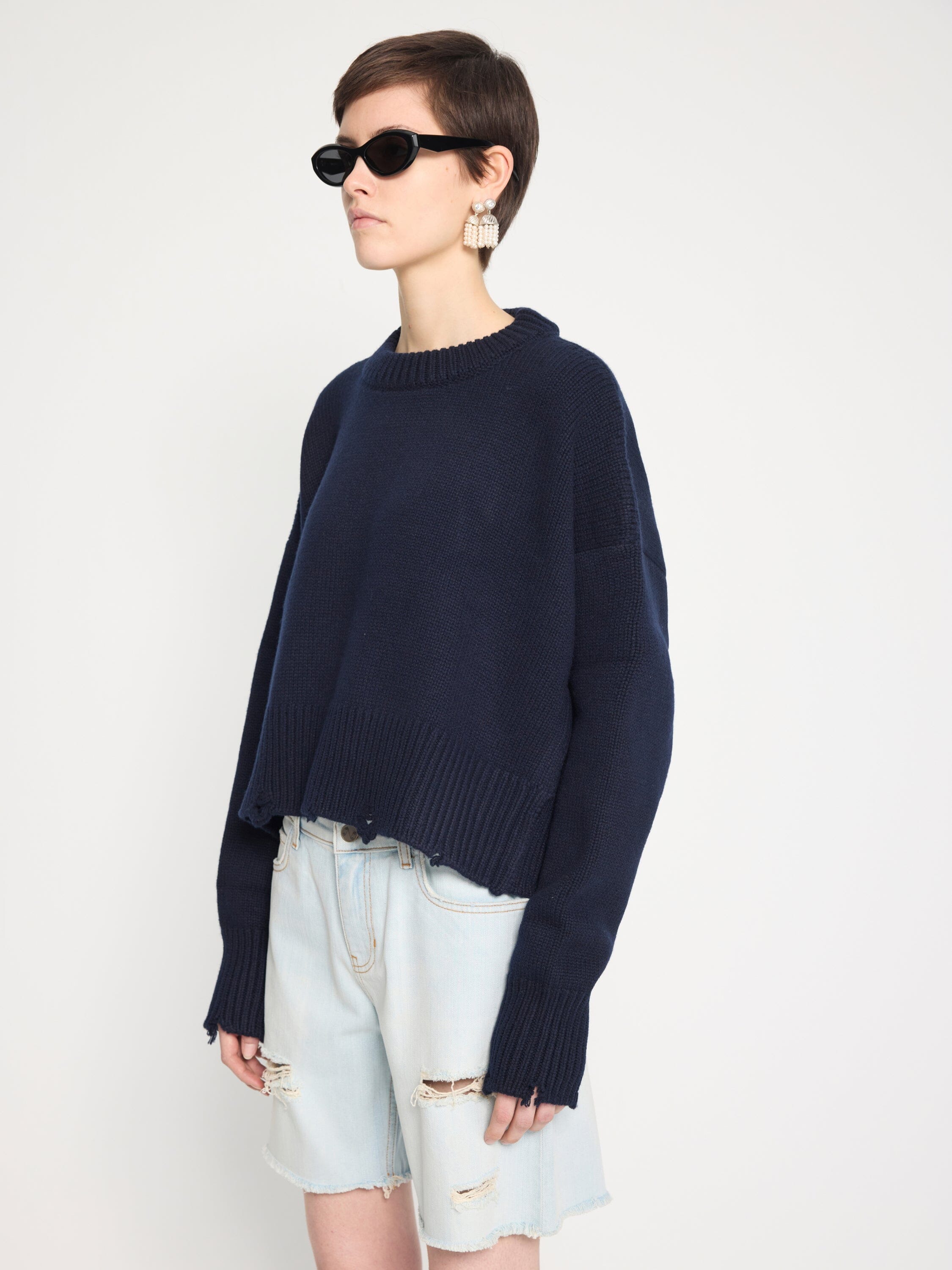 Nackiyé's iconic Avalanche has been updated for the impending summer, featuring distressed capped sleeves and waist for a twist on the original. A loose fitting cashmere & wool cropped jumper in a luxuriously soft, lightweight cashmere and wool blend.