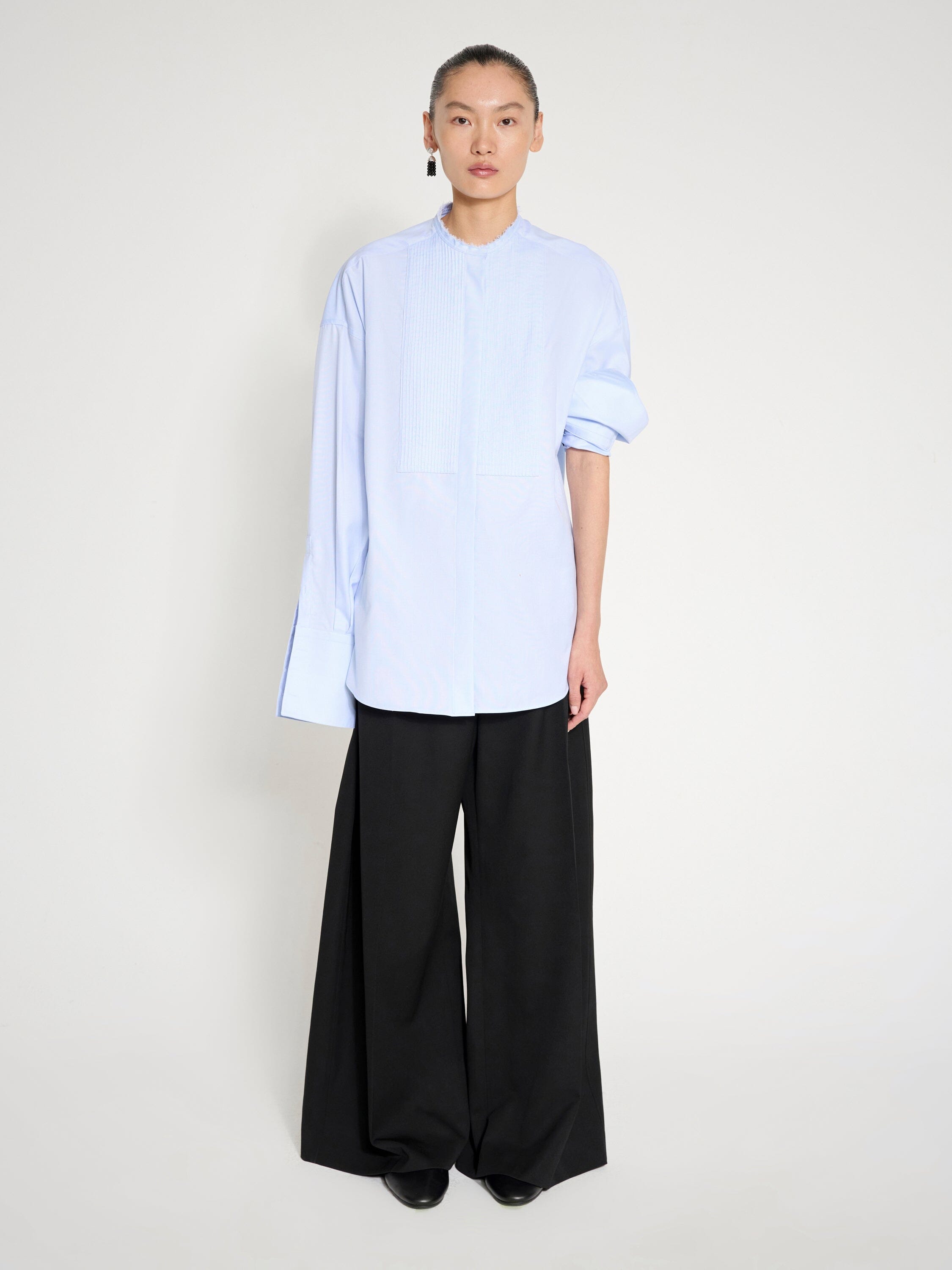 The Tux is an oversized tuxedo shirt with a raw edged mandarin collar, a play on the classic version. Crafted from a fine English cotton fabric by Thomas Mason, its pleated front bib, exaggerated cuff links and hallmark embroidered 'N' is the perfect antidote for a playful polished look.